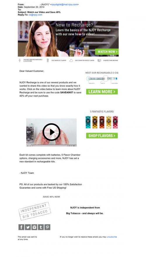 Email from NJOY received September 2014 containing a link for a how-to video and a coupon code for 40% off the next purchase.
