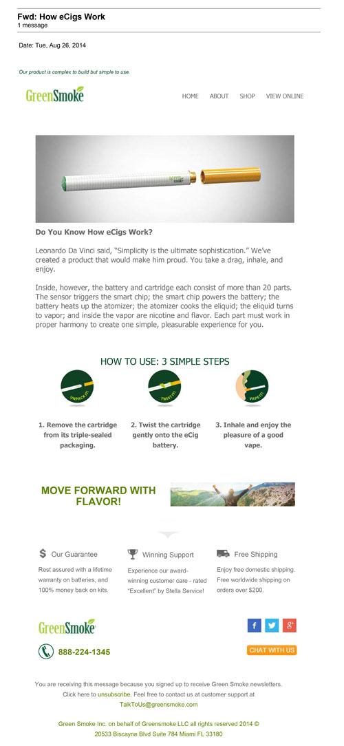 Email received from GreenSmoke August 2014 informing customer how the e-cigarette works. The email lists 3 simple steps: unpack it, twist it, vape it.