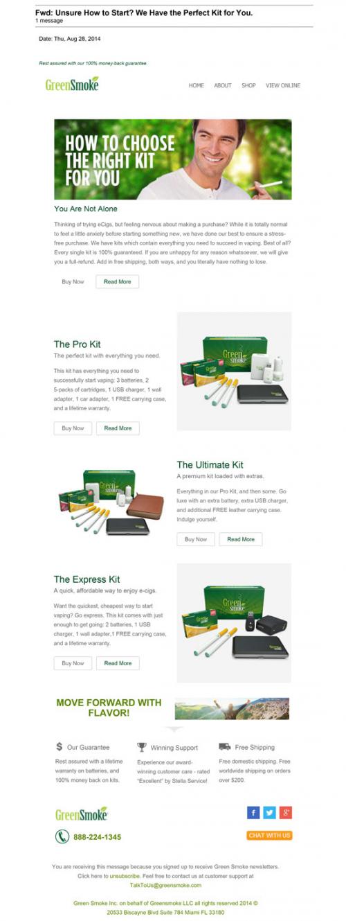 Email received from GreenSmoke August 2014 showcasing the different starter kits available.