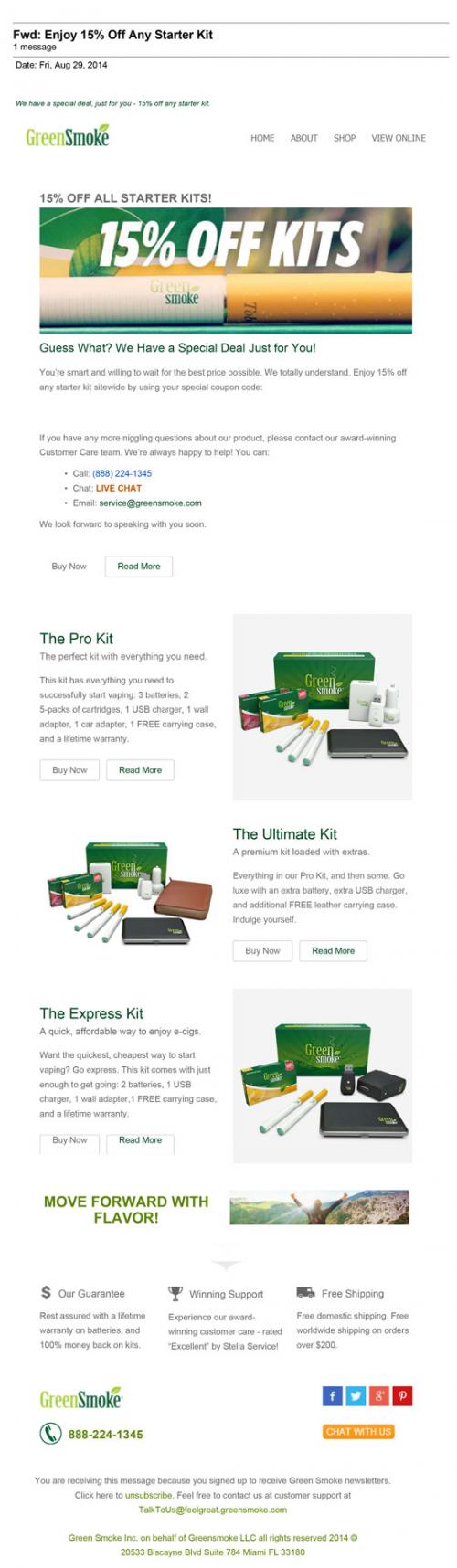 Email received from GreenSmoke August 2014 showcasing the different starter kits available. The email also offers 15% off all kits with special coupon code.