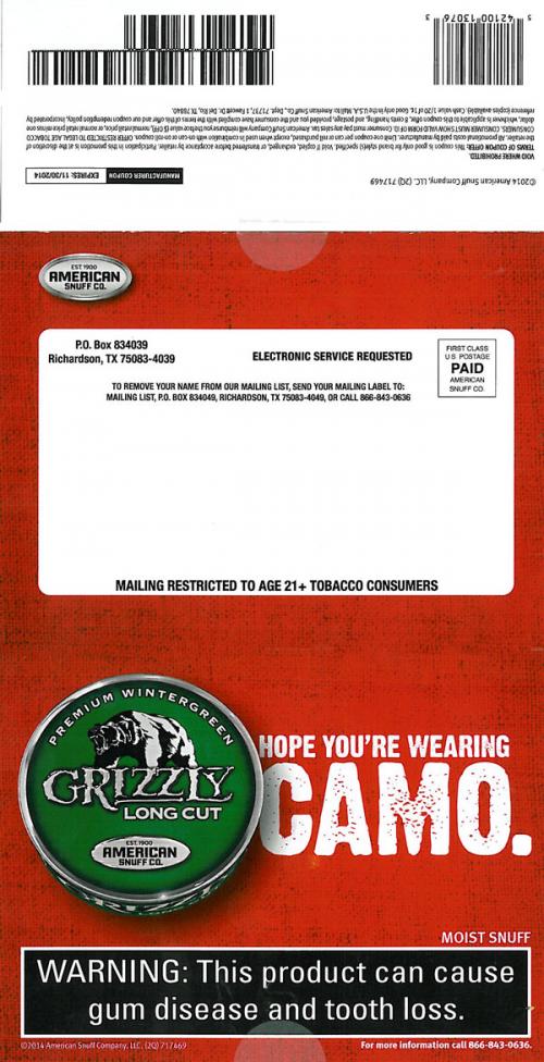 Direct mail received from Grizzly September 2014 containing coupon inside for $1off a can. Invites receiver to brand website to claim a coupon every week. Text: "Hope your wearing camo. Cause here comes a buck."