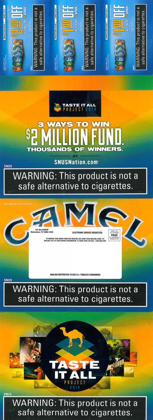Direct mail received from Camel Snus September 2014 containing coupons. The direct mail also informs receiver about Camel\'s Taste It All Project. Direct mail piece contains a smaller insert with abbreviated rules and guidelines for the contest and directs receiver to SNUSNation.com to create a one-of-a-kind poster.
