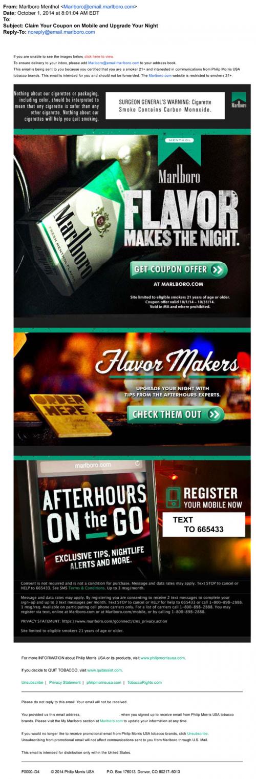 Email from Marlboro on October 1, 2014 inviting the receiver to access their coupon specifically via their mobile phone. The email also has an invitation to "upgrade your night with tips from the Afterhours Experts" on the website, as well as an offer to register the user's mobile for exclusive tips and nightlife alerts via texting capabilities.