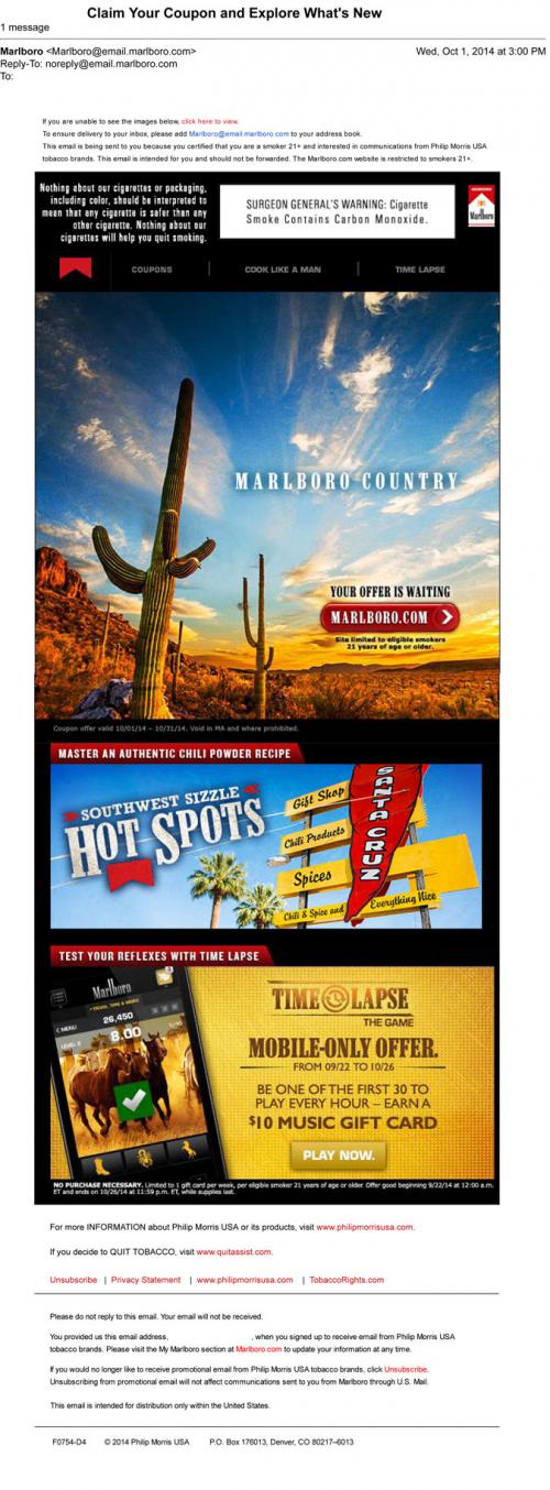 from Marlboro on October 1, 2014 letting the receiver know that coupons are available online at Marlboro.com. Users are