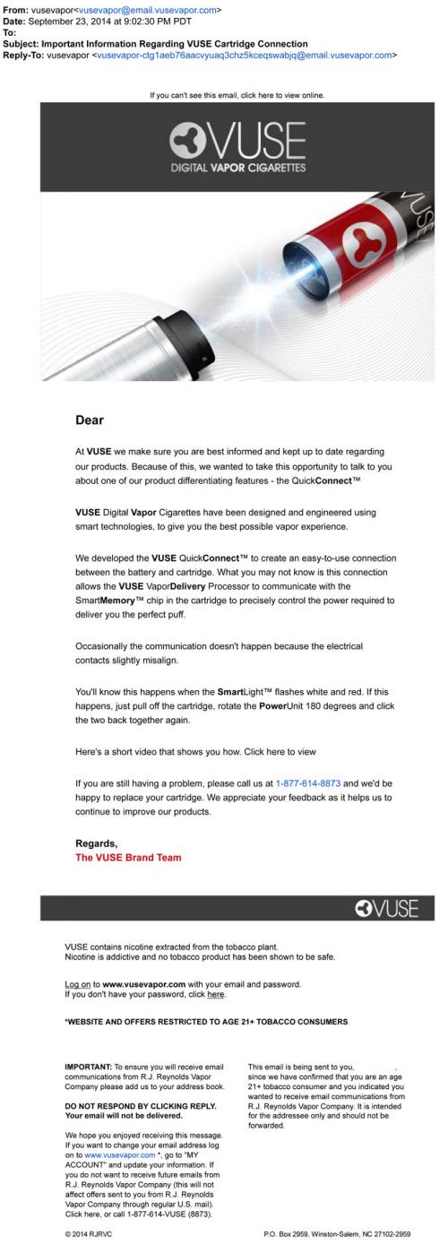 Informational email from Vuse sent September 23, 2014 explaining the "QuickConnect" feature of their e-cigarettes. The email describes how the connection between the "VaporDelivery Processor" and the "SmartMemory" chip in the cartridges may fail due to misaligned electrical contacts. A video is linked to show the recipient how to troubleshoot this error. The brand team offers a replacement if further issues are encountered.