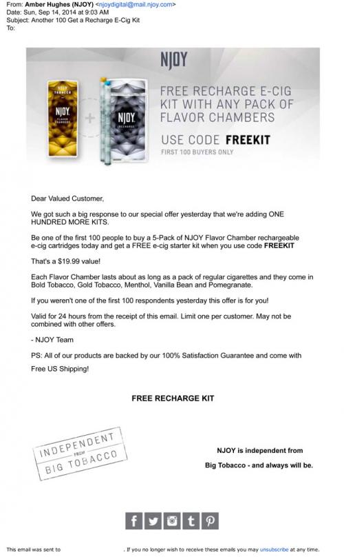 Email from NJOY announcing an expansion of their recent promotional offer of a free rechargeable kit with the purchase of a pack of flavor cartridges for another 100 customers. Promotes their flavors Bold, Gold, Menthol, Vanilla Bean, and Pomegranate.