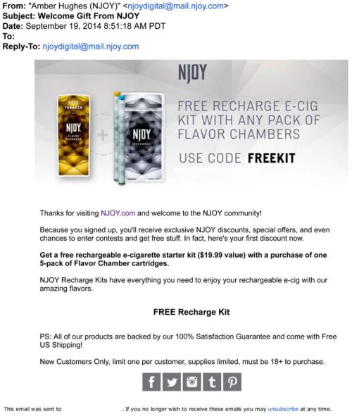 Email from NJOY welcoming the user for signing up at the brand website. Includes an offer for a free rechargeable kit with the purchase of a package of flavor cartridges.