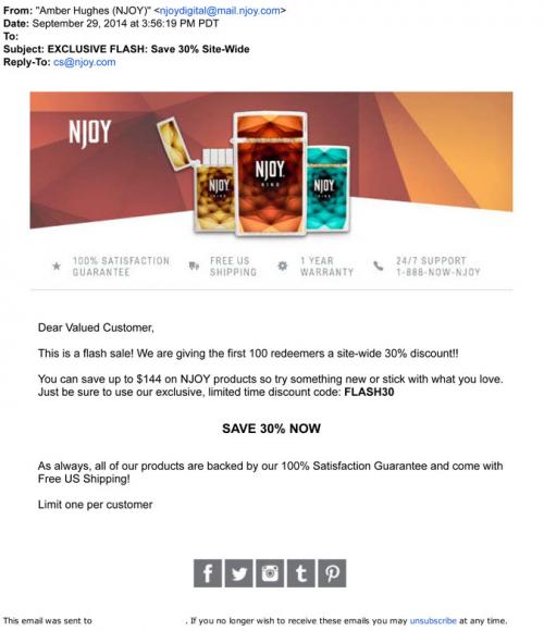 Email from NJOY promoting a 'flash sale' for the first 100 customers of 30% off their order with a limited time discount code.