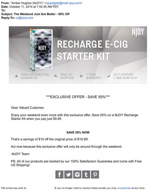 Email from NJOY announcing a limited weekend deal for 50% off the price for a rechargeable starter kit. Slightly different version of a previous promotion. "The Weekend Just Got Better."