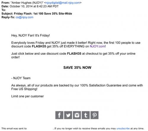 35% off their purchase with a limited time discount code. Text: "Everybody loves Friday and NJOY just made it better!"