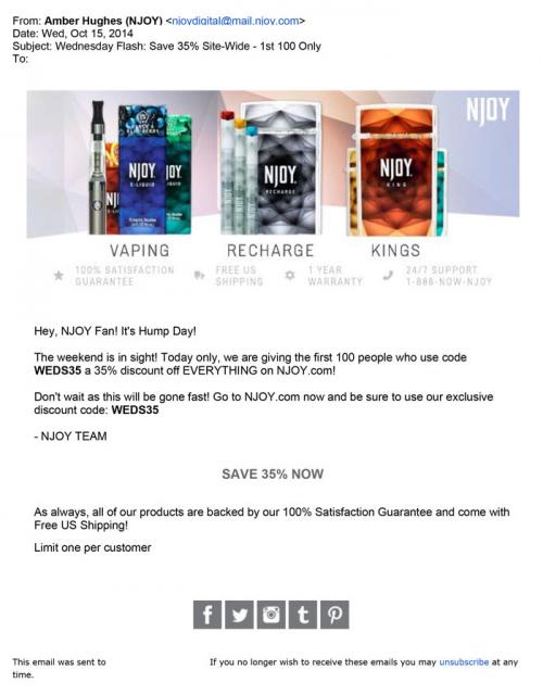 Email from NJOY received October 15, 2014 informing user about a special midweek sale. Email instructs user to act fast because only the first 100 people will save 35% on the entire site.