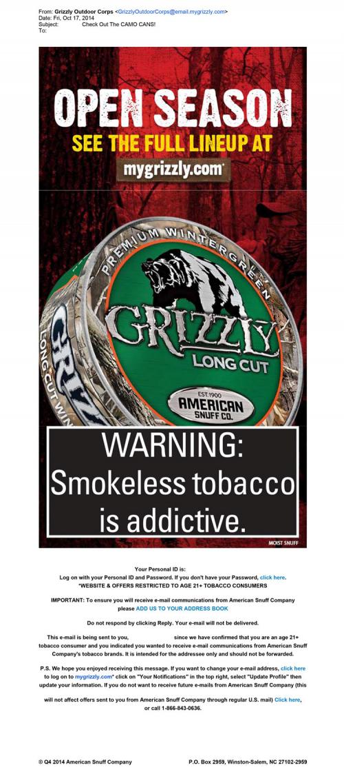 Email received from Grizzly October 17, 2014 announcing the camo can. Email also invites the receiver to the brand website to check out the full line-up of Grizzly products.