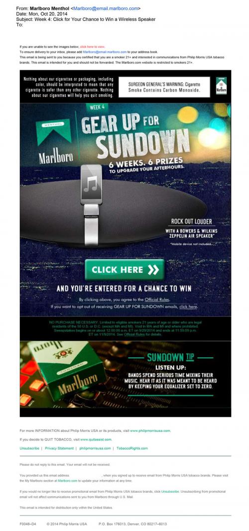 Email from Marlboro received October 20, 2014 reminding user to enter this week for the "Gear Up For Sundown" sweepstakes. The email allows the user to click a direct link in the email for entry, no additional signing in required. Week 4 prize includes a Bowers & Wilkins Zeppelin Air Speaker. The email ends with a "sundown tip." Text: "Listen Up: Bands spend serious time mixing their music. Hear it as it was meant to be heard by keeping your equalizer set to zero."
