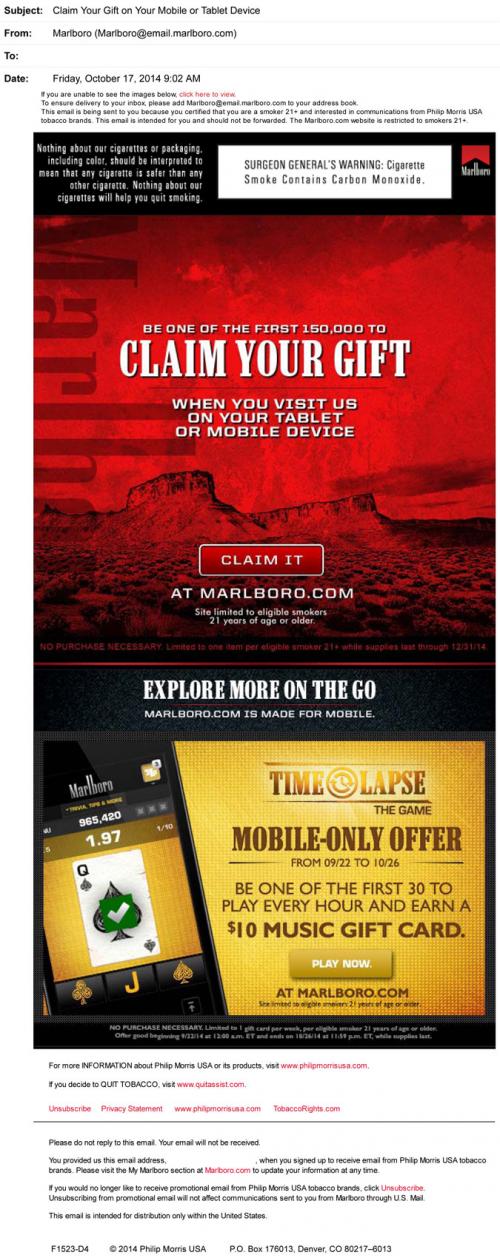 Email from Marlboro in October 2014 inviting the recipient to 'be one of the first 150,000' to claim a gift on the brand website via a tablet or mobile device. With the slogan 'Explore more on the go: Marlboro.com is made for mobile', the brand is heavily promoting mobile access. The email also mentions the Time Lapse mobile game, where players can be one of the first 30 to play every hour for the chance to win a 10$ music gift card.