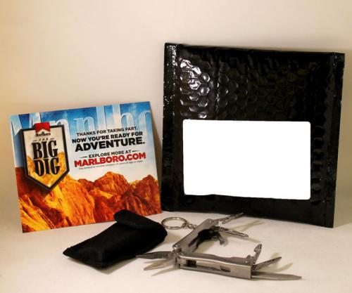 Gift received from Marlboro for signing up with 'the Big Dig'. Arrived in a plain black bubble mailer. Multi-tool on a keychain; comes in a small pouch with a loop for hanging on a belt. Text: "Thanks for taking part. Now you're ready for adventure."