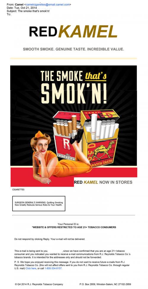 Email received from October 2014 promoting RedKamel. Text: "Smooth smoke. Genuine taste. Incredible value. The smoke that's smok'n!"