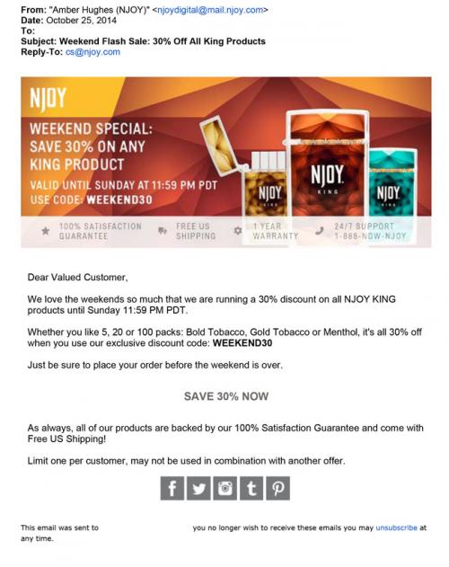 Email from NJOY received October 2014 promoting a special weekend sale on all NJOY King products with a limited time discount code.