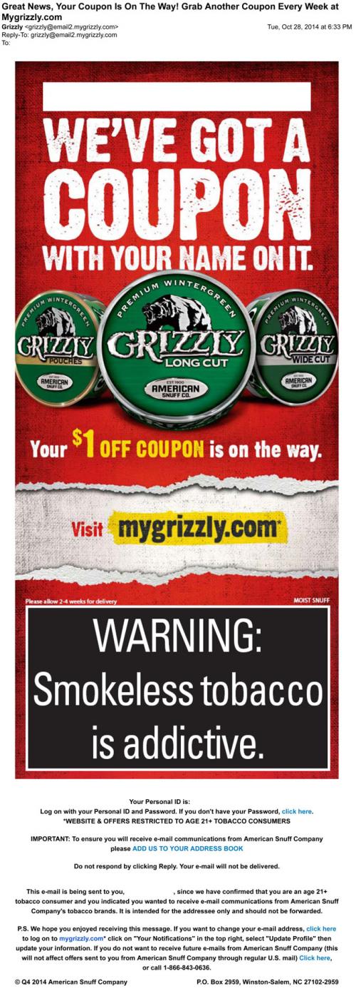 Email from Grizzly addressing the recipient by name, letting them know that a 1$ off coupon is on the way: "We've got a coupon with your name on it." Email also directs the recipient to the brand website.