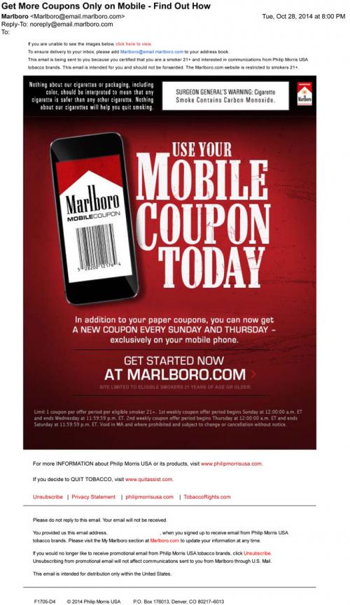 Email from Marlboro in October 2014 promoting their new exclusive mobile phone coupons, available twice a week in addition to their paper coupon offers.
