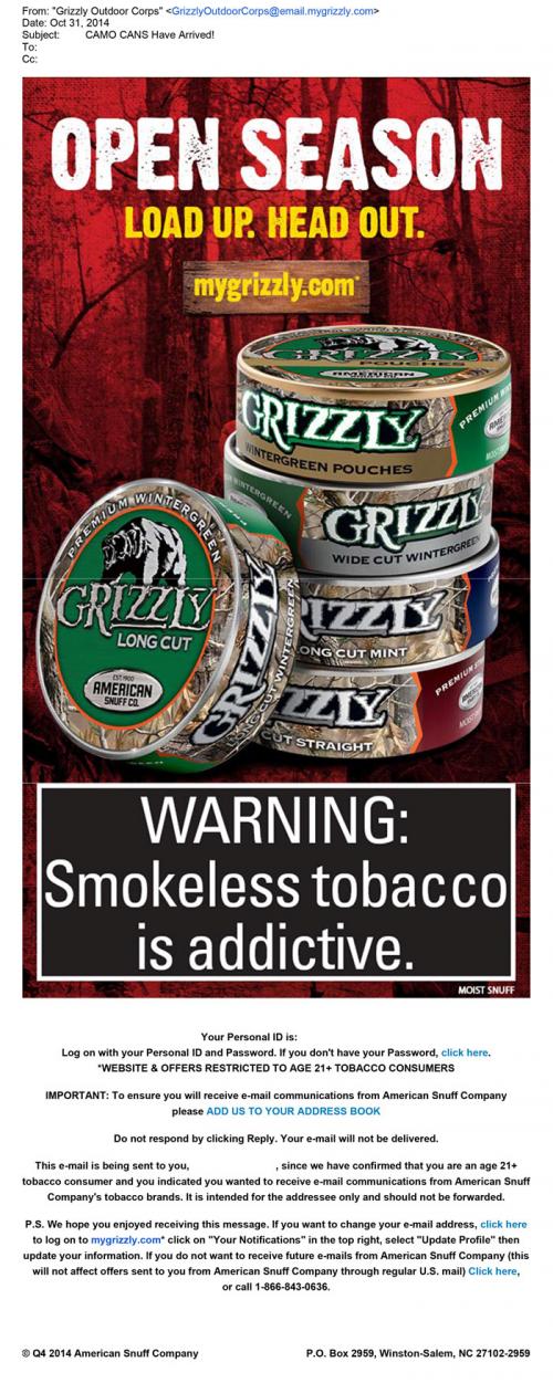 Email received from Grizzly October 31, 2014 announcing the camo can. Email also invites the receiver to the brand website mygrizzly.com. Text: "Open Season. Load Up. Head Out."