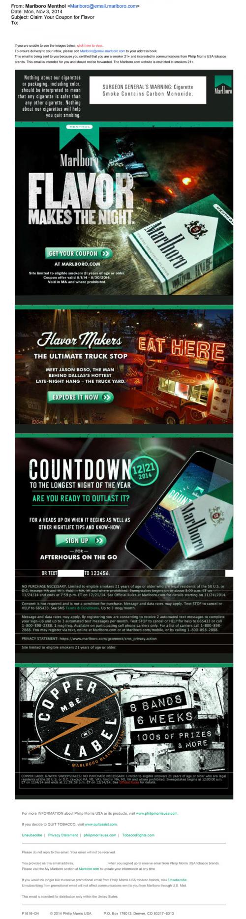 E-mail from Marlboro received in November 2014 encouraging the receiver to visit the brand's website to claim this month's coupon, explore the flavor makers ultimate truck stop, sign up for afterhours on the go and enter the copper label sweepstakes.