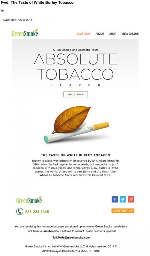 Email from GreenSmoke in November 2014 promoting their Absolute Tobacco flavor that is meant to recreate the taste of white burley tobacco.