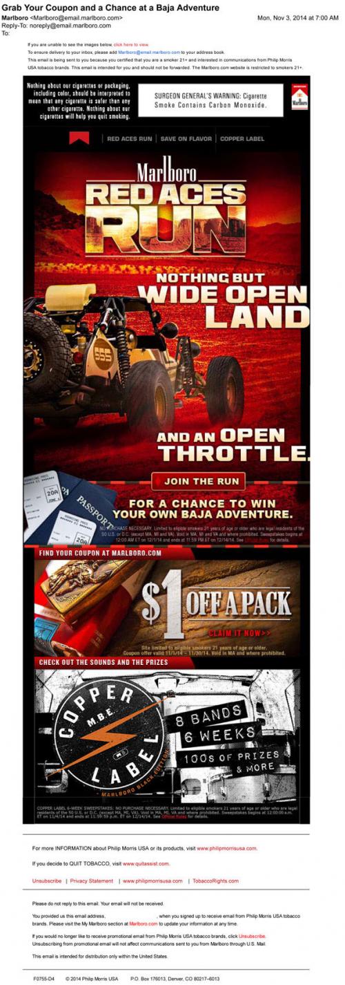 Sweepstakes. The email also includes a link to the brand website to claim a coupon for $1 off a pack and a promotion for the Copper Label sweepstakes featuring musicians and prizes. Text: "Nothing but wide open land and an open throttle."