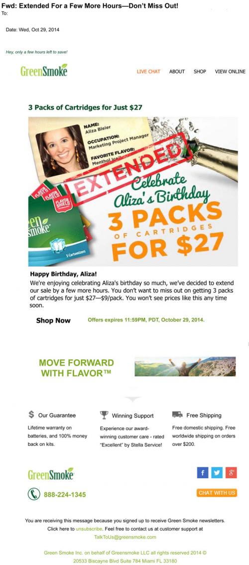 Email from GreenSmoke in October 2014 announcing an extension on their sale to celebrate