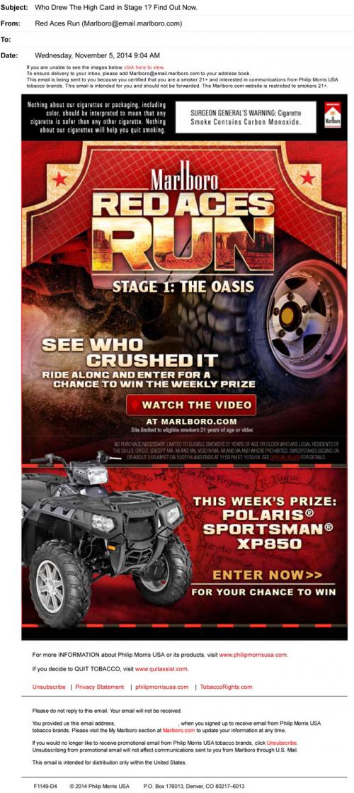 An email update from Marlboro's Red Aces Run sweeps inviting the recipient to watch a video covering Stage 1 on the brand website. The email also features a promotion for the current weekly prize, an all-terrain vehicle.