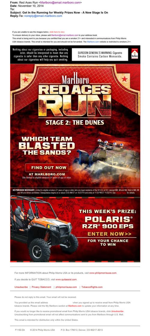 An email update received on November 10, 2014 from Marlboro's Red Aces Run sweeps inviting the recipient to watch a video covering Stage 2 on the brand website. The email also features a promotion for the current weekly prize, an off-road vehicle.