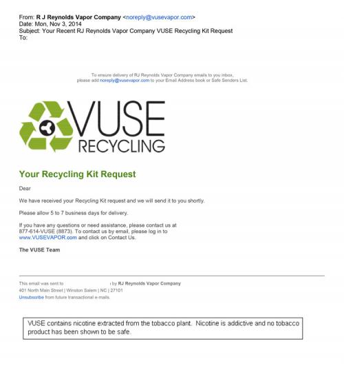 Email received from VUSE November 3, 2014 informing the user that the Vuse Recycling Kit they requested is on the way.