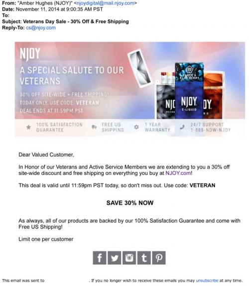Email from NJOY on November 11, 2014 promoting their Veterans Day sale; customers at the brand website will get 30% off "In Honor of our Veterans and Active Service Members."