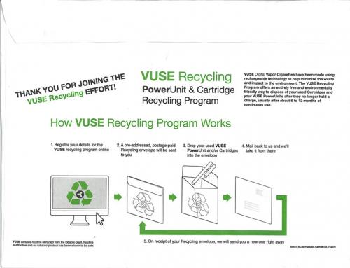 Direct mail from Vuse as a result of registering for the Vuse Recycling Program. A padded, pre-paid and unmarked envelope was sent within the large white envelope. Black and green ink on the outer envelope describe how the recycling program works; customers are instructed to mail used PowerUnits and cartridges back to Vuse for safe disposal. PowerUnits contain a rechargeable Lithium-Ion battery.