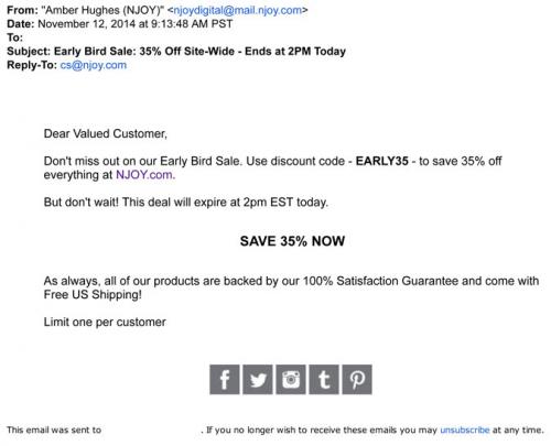 Email on November 12, 2014 promoting an "early bird" sale at NJOY's brand website. With the code, customers could receive 35% off their order before 2pm EST.