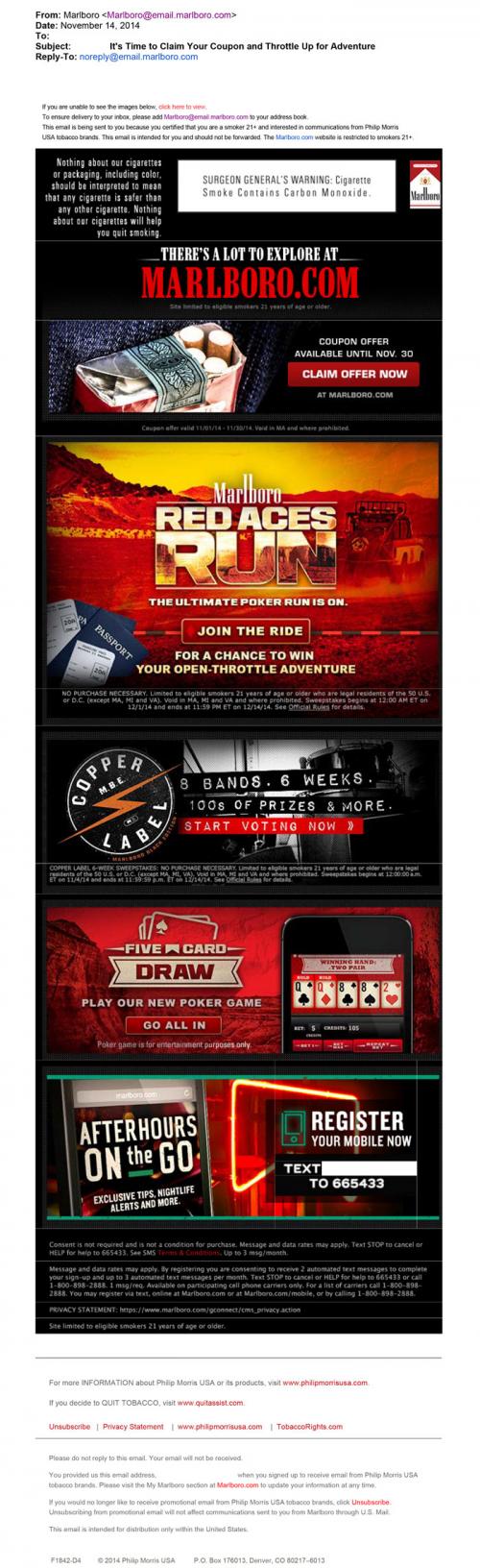 Email from Marlboro received November 14, 2014 promoting the Red Aces Run Sweepstakes. The email also directs the recipient to the brand website to claim a coupon, vote for Copper Label sweepstakes featuring musicians, play the new Five Draw poker game and sign up for mobile updates with AfterHours On The Go.