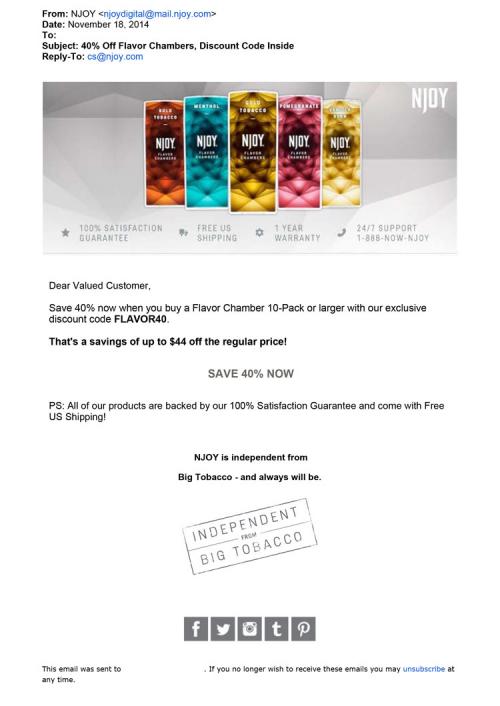 Email from NJOY received on November 18, 2014 promoting a special sale for valued customers when they use the discount provided. The discount code is good for 40%off flavor chambers 10-pack or larger.