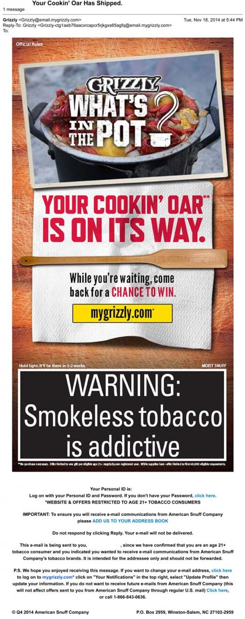 E-mail Promotions-Promo items/Gifts Smokeless Tobacco Sweepstakes