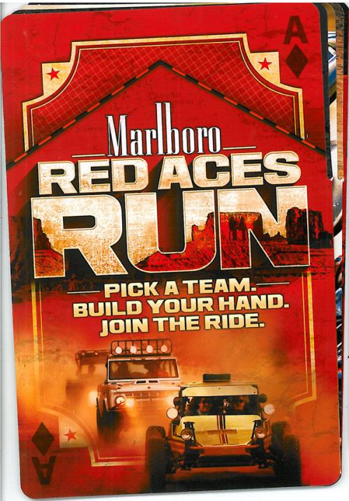 Direct mail received from Marlboro in November 2014. Piece is promoting Marlboro's Red Aces Run Sweepstakes. The multi-fold piece looks like a fanned out deck of cards. Piece features photos of the racers as well as the weekly prizes. The direct mailing included two additional inserts. The first is 2 coupons and the other is a reminder to sign up for mobile updates for Marlboro's Copper Label.