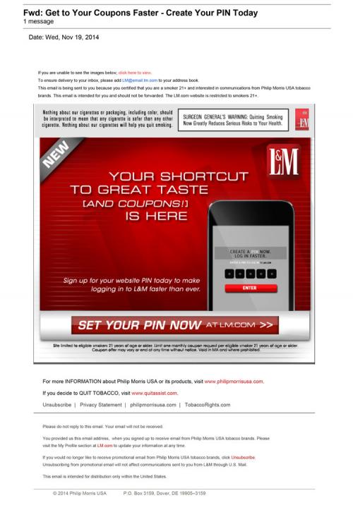Email from L&M received November 19, 2014 informing recipient of a new faster way to log in to LM.com by creating a pin.
