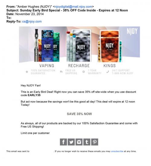 Email received from NJOY November 23, 2014 informing recipient of a "Sunday Early Bird Special." The email contains a code for 35% off the site until noon on Sunday.