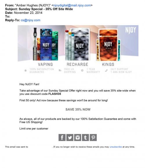 Email from NJOY received November 23, 2014 informing user about a special Sunday sale. Email instructs user to act fast because only the first 50 people will save 35% on the entire site.