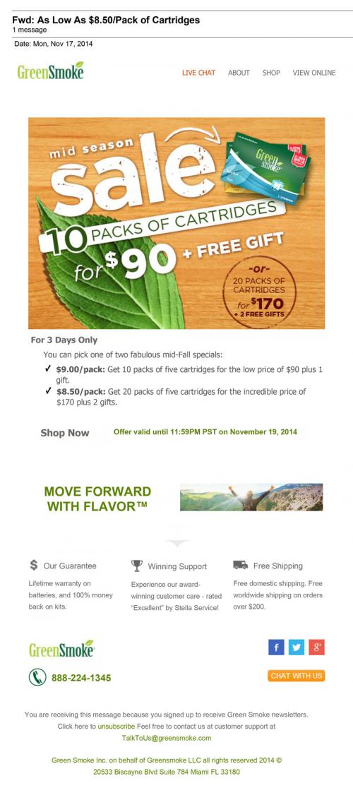 Email received from GreenSmoke November 2014 informing recipient of the mid-season sale. The fall sale lasts only 3 days. Recipient has two options of saving on cartridges and also gets a free gift with purchase.