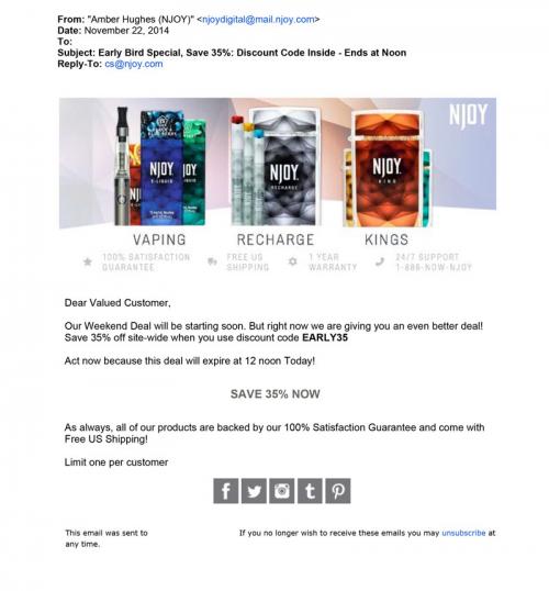 Email received from NJOY November 22, 2014 informing recipient of a "Early Bird Special." The email contains a code for 35% off the site until noon of that day.