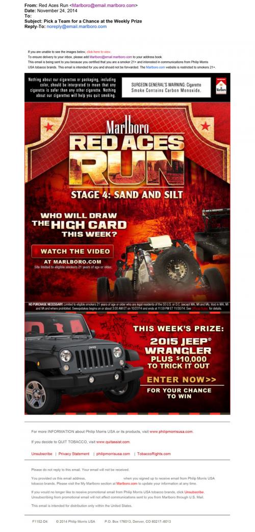 An email update received on November 24, 2014f rom Marlboro's Red Aces Run sweeps inviting the recipient to watch a video covering Stage 4 on the brand website. The email also features a promotion for the current weekly prize, a 2015 Jeep Wrangler plus $10,000 to customize it.