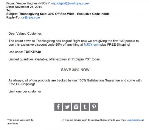 Email received from NJOY on November 24, 2014 promoting a Thanksgiving sale. The first 100 people will receive a 30% discount on the entire site.