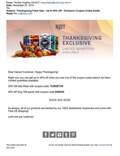 Email received from NJOY November 27, 2014 wishing recipient a Happy Thanksgiving and informing them of a special exclusive holiday sale. The email contains two discount codes for NJOY.com