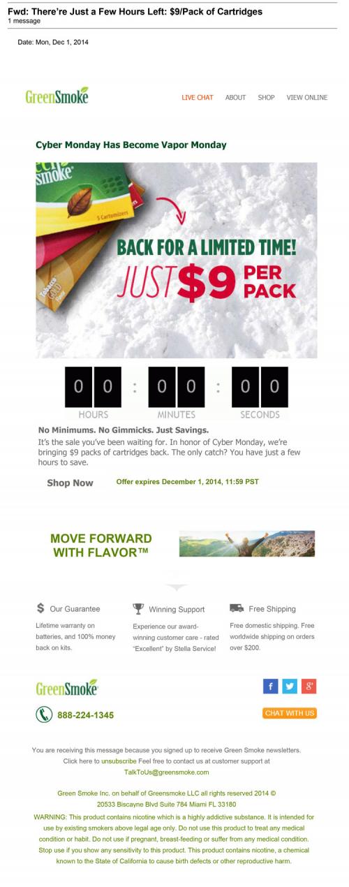 Email received from GreenSmoke December 1, 2014 informing customer that the $9 cartridge sale is back for a limited time as a Cyber Monday special.