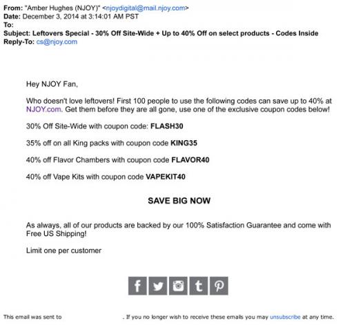 Email from NJOY promoting a "Leftovers Special," where they are continuing the sales from the recent Thanksgiving holiday. Text: "Who doesn't love leftovers!"