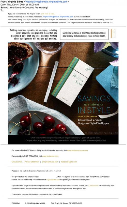 Email from Virginia Slims in December 2014 reminding the recipient to go to the brand website to access monthly coupons. The email also offers a free downloadable wallpaper.