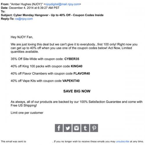 Email from NJOY promoting limited continuing deals from their Cyber Monday sale as a "Cyber Monday Hangover".